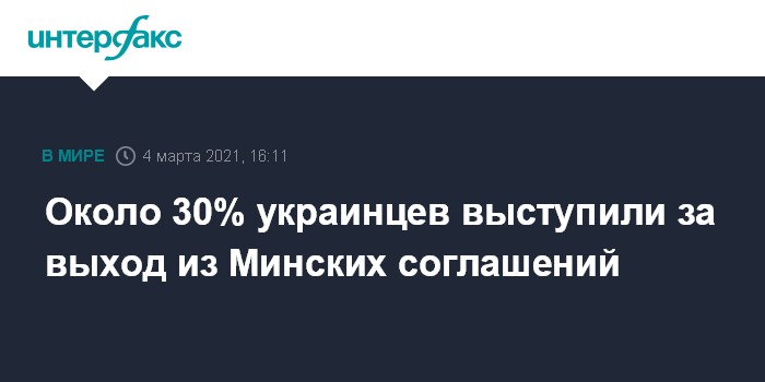 Москва. 4 марта. INTERFAX.RU - 45,3% населения Украины считают необходимым выполнение Украиной Минских соглашений по урегулированию ситуации на Донбассе, свидетельствуют данные социологического опроса, проведенного Центром "Социальный мониторинг" с 19 по 28 февраля.