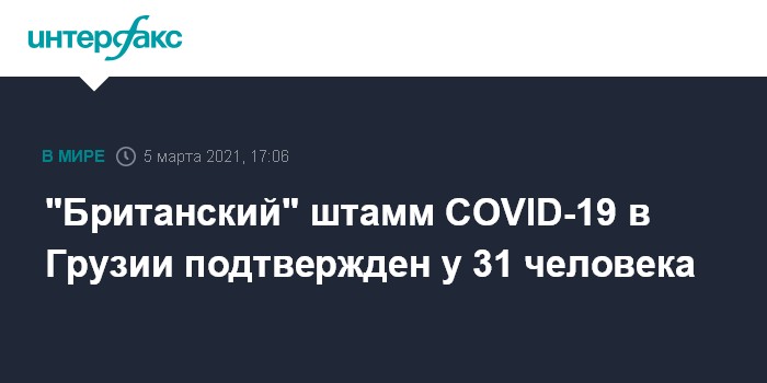 Москва. 5 марта. INTERFAX.RU - В Грузии у 31 человека подтвержден так называемый британский штамм коронавируса COVID-19, сообщил в пятницу заместитель генерального директора Национального центра по контролю за заболеваниями страны Паата Имнадзе.