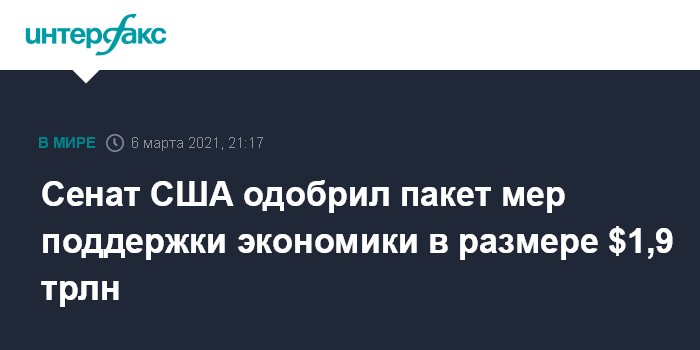 Москва. 6 марта. INTERFAX.RU - Сенат США принял пакет мер поддержки экономики в условиях пандемии объемом $1,9 трлн, предложенный президентом страны Джо Байденом.