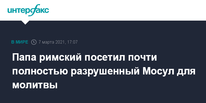 Понтифик прилетел в Мосул на вертолете в воскресенье в рамках визита в Ирак, чтобы "помолиться за умерших представителей всех религий", говорится в сообщениях. Мусульманские и христианские жители города рассказали папе о своей жизни под гнетом ИГ.