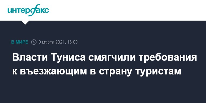 В соответствии с коммюнике главы правительства Туниса, в период с 8 по 28 марта 2021 года иностранцы, которые забронировали номер в одном из отелей, должны предоставить отрицательный ПЦР-тест, сделанный в течение 72 часов до прибытия в страну, а также пройти экспресс-тест в пункте прибытия. Кроме того, теперь самоизолироваться в отеле необходимо на два, а не на семь дней, как было ранее. После карантина, не покидая номер, надо будет пройти ПЦР-тест за свой счет до получения отрицательного результата теста.