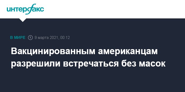Москва. 9 марта. INTERFAX.RU - Американцы, получившие обе дозы вакцины от коронавируса, могут собираться в помещении друг с другом без ношения маски или социального дистанцирования. Такие рекомендации появились в руководстве Центров по контролю и профилактике заболеваний в понедельник, сообщается на сайте Associated Press.