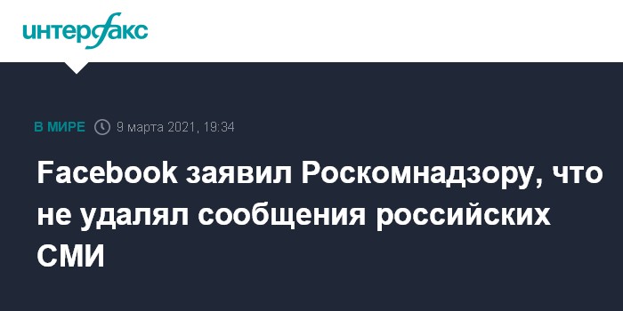 Москва. 9 марта. INTERFAX.RU - Facebook не удалял сообщения в официальных аккаунтах российских СМИ, восстановление доступа к которым ранее требовал Роскомнадзор, сообщили "Интерфаксу" к компании.