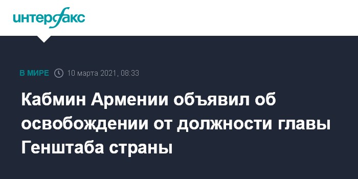 Москва. 10 марта. INTERFAX.RU - Начальник Главного штаба ВС Армении Оник Гаспарян с 10 марта считается освобожденным от должности вступившим в действие силой закона указом, сообщает пресс-служба правительства.