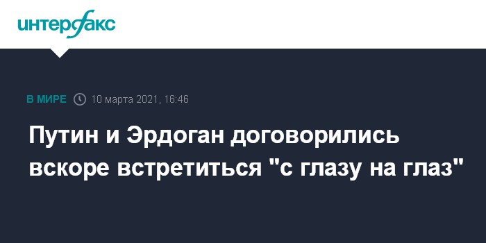 Москва. 10 марта. INTERFAX.RU - Президент РФ Владимир Путин и президент Турции Реджеп Тайип Эрдоган договорились встретиться в ближайшее время.