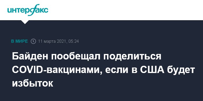Москва. 11 марта. INTERFAX.RU - Если в США в ходе кампании иммунизации населения от коронавируса образуется избыток вакцин, страна готова поделиться ими с другими государствами, заявил американский президент Джо Байден.
