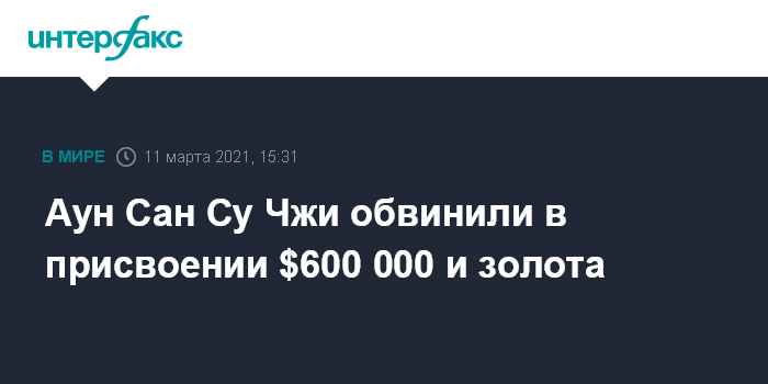 Москва. 11 марта. INTERFAX.RU - Пришедшие к власти в Мьянме военные обвинили бывшего лидера страны, госсоветника Аун Сан Су Чжи в незаконном получении $600 000 и золота на чуть большую сумму. Об этом объявил бригадный генерал Зо Мин Тун, передает BBC News. Никаких доказательств этому он не представил.