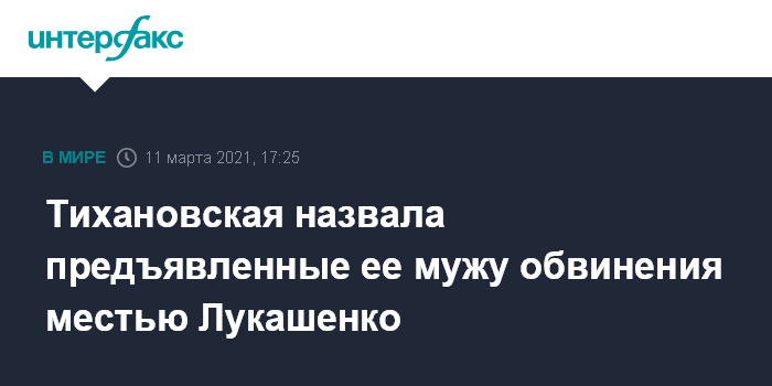 Москва. 11 марта. INTERFAX.RU - Экс-кандидат в президенты Белоруссии Светлана Тихановская назвала предъявленные ее мужу обвинения личной местью Александра Лукашенко.