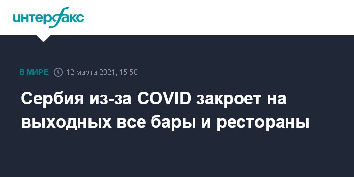 Москва. 12 марта. INTERFAX.RU - Сербия закроет все бары, рестораны и большинство магазинов на выходных из-за роста числа заражений коронавирусом в стране, сообщает агентство Associated Press.