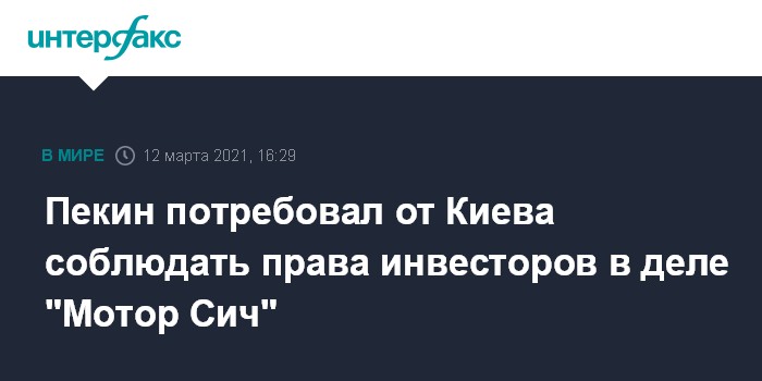 Москва. 12 марта. INTERFAX.RU - Пекин требует, чтобы Киев в соответствии с законом защищал интересы китайских инвесторов в связи с решением о национализации предприятия "Мотор Сич", более 50% акций которого принадлежит китайским компаниям, сообщил представитель МИД КНР Чжао Лицзянь.