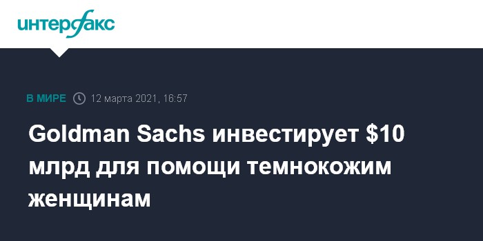 Москва. 12 марта. INTERFAX.RU - Американский банк Goldman Sachs Group Inc. в течение следующих десяти лет вложит $10 млрд в компании и организации, которые помогают темнокожим женщинам.