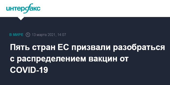 Москва. 13 марта. INTERFAX.RU - Австрия, Чехия, Словения, Болгария и Латвия призвали провести европейский саммит, чтобы обсудить диспропорции в распределении вакцин против коронавируса между государствами ЕС, говорится в совместном письме этих государств, опубликованном в субботу.