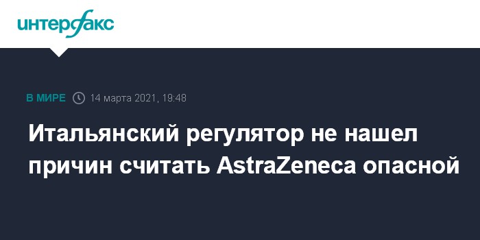 Москва. 14 марта. INTERFAX.RU - Надежных данных о том, что вакцина против COVID-19 от AstraZeneca представляет опасность для здоровья, пока нет, заявил в глава Итальянского агентства по лекарственным средствам Джорджо Палу, которого цитирует итальянское телевидение.