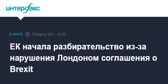 Москва. 15 марта. INTERFAX.RU - Еврокомиссия запустила юридическую процедуру разбирательства в отношении Великобритании, так как усмотрела в ее действиях нарушение соглашения о Brexit, сообщают в понедельник европейские СМИ.