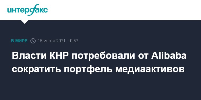 Москва. 16 марта. INTERFAX.RU - Правительство Китая требует от крупнейшей в стране интернет-компании Alibaba Group Holding Ltd. избавиться от ее медиаактивов, пишет газета The Wall Street Journal со ссылкой на осведомленные источники.