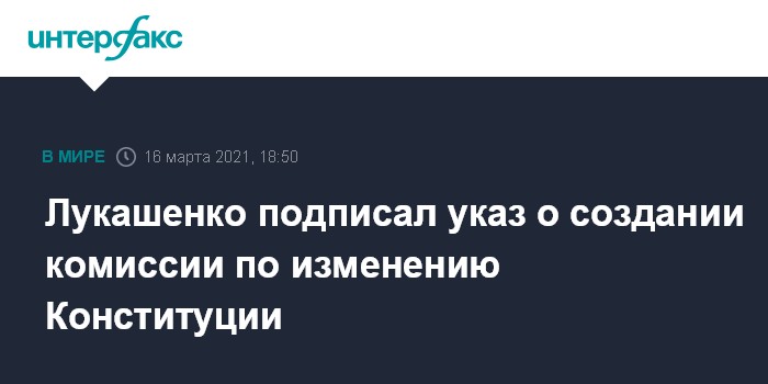 Москва. 16 марта. INTERFAX.RU - Президент Белоруссии Александр Лукашенко подписал указ №105 о Конституционной комиссии, которая до 1 августа текущего года должна представить предложения по изменению Основного закона. Об этом сообщили во вторник в пресс-службе главы государства.