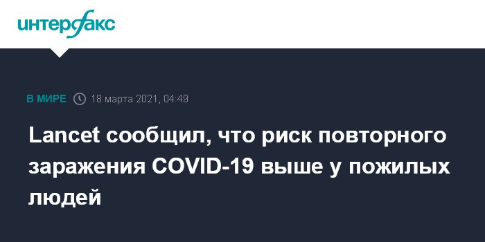 Москва. 18 марта. INTERFAX.RU - Люди старше 65 лет, переболевшие COVID-19, имеют больше шансов повторно заразиться коронавирусом, чем более молодые, свидетельствуют данные исследования, опубликованного научным журналом The Lancet.