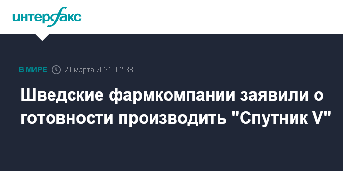 Москва. 21 марта. INTERFAX.RU - Российскую вакцину против коронавируса "Спутник V" готовы производить несколько шведских фармацевтических компаний, пишет газета Svenska Dagbladet.