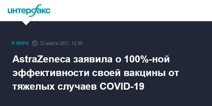 Москва. 22 марта. INTERFAX.RU - Представители AstraZeneca и Оксфордского университета заявили, что клинические испытания в США, Перу и Чили вакцины от коронавируса их совместного производства показали, что препарат на 100% предотвращает тяжелые формы COVID-19 и на 79% - заболевание с симптомами.
