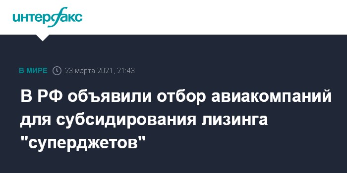 Москва. 23 марта. INTERFAX.RU - Минпромторг РФ объявил отбор авиакомпаний для субсидирования в 2021 году лизинговых платежей за эксплуатацию самолетов Superjet 100. Соответствующий приказ опубликован на сайте ведомства.