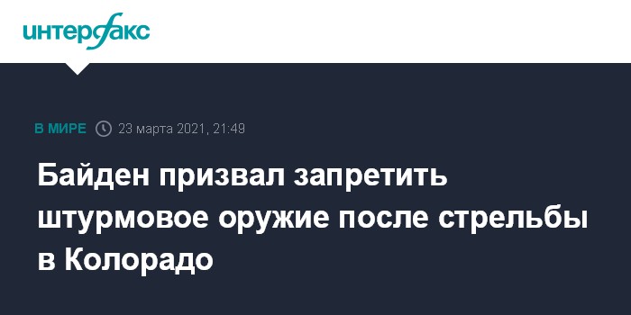 Москва. 23 марта. INTERFAX.RU - Президент США Джо Байден во вторник после массовой стрельбы в Боулдере (штат Колорадо, США), в которой погибли 10 человек, призвал Конгресс принять законодательство, запрещающее продажу штурмового оружия.