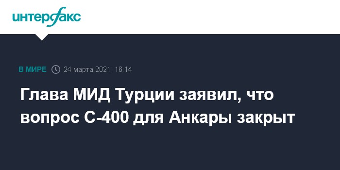 Москва. 24 марта. INTERFAX.RU - Анкара не собирается отказываться от приобретенных у РФ зенитных ракетных систем (ЗРС) С-400, но готова обсуждать с США будущие закупки вооружений, заявил в среду глава МИД Турции Мевлют Чавушоглу после переговоров с госсекретарем Соединенных Штатов Энтони Блинкеном в Брюсселе.