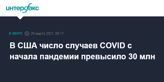 Москва. 25 марта. INTERFAX.RU - В Соединенных Штатах с начала пандемии коронавируса выявлено 30 001 245 случаев заражения COVID-19, сообщил университет Джонса Хопкинса.