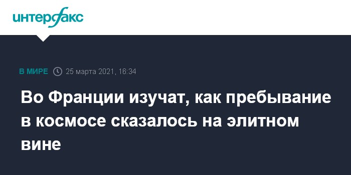 Москва. 25 марта. INTERFAX.RU - Специалисты из Франции устанавливают, каким образом длительное пребывание в космосе элитного вина сказывается на его качестве, сообщает в четверг портал "Вен минют".