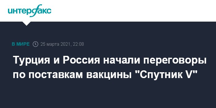Москва. 25 марта. INTERFAX.RU - Турция и Россия запустили переговорный процесс по поставкам вакцины против коронавируса COVID-19 "Спутник V", сообщил глава Минздрава республики Фахреттин Коджа.