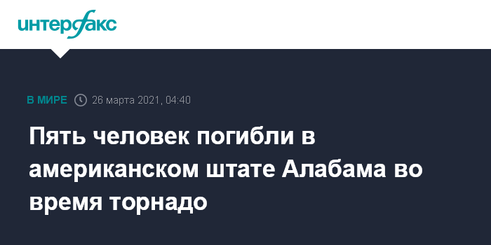 Москва. 26 марта. INTERFAX.RU - Смертоносные торнадо пронеслись по американскому штату Алабама в четверг, по меньшей мере пять человек погибли, сообщает NBC News.