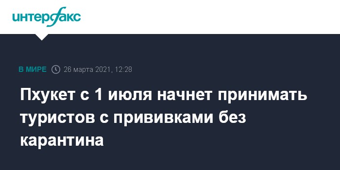 "Комитет по инфекционным заболеваниям Таиланда одобрил план по открытию Пхукета с 1 июля для иностранных туристов. Согласно плану, при вакцинации 70% жителей острова будет получен коллективный иммунитет, и иностранцы с прививками смогут отдыхать на острове без соблюдения карантина", - пишет издание.