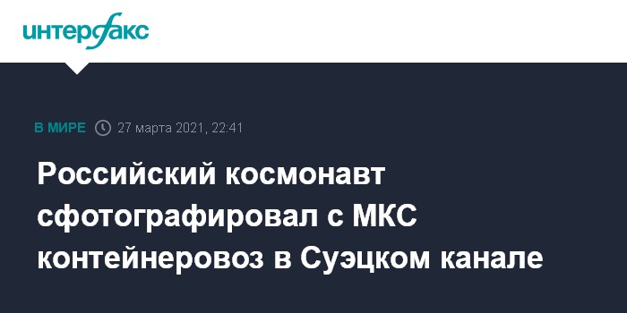 Москва. 27 марта. INTERFAX.RU - Космонавт Сергей Кудь-Сверчков заснял с МКС контейнеровоз Ever Given, севший на мель в Суэцком канале и заблокировавший движение по нему. Снимки он опубликовал в своем инстаграме.