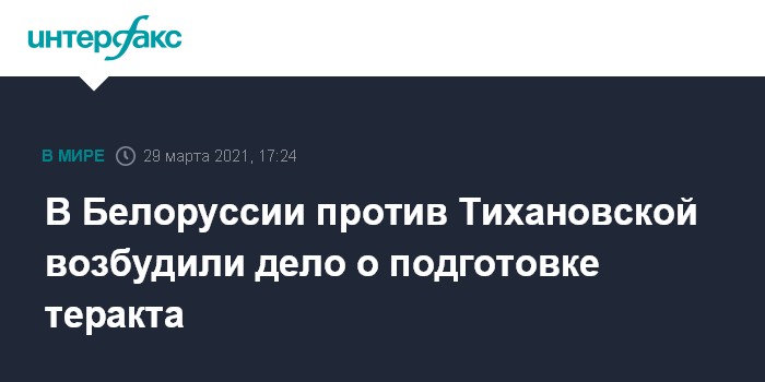 Москва. 29 марта. INTERFAX.RU - Генпрокуратура Белоруссии возбудила в отношении экс-кандидата на пост президента страны Светланы Тихановской уголовное дело о подготовке акта терроризма, сообщил журналистам в понедельник белорусский генпрокурор Андрей Швед.