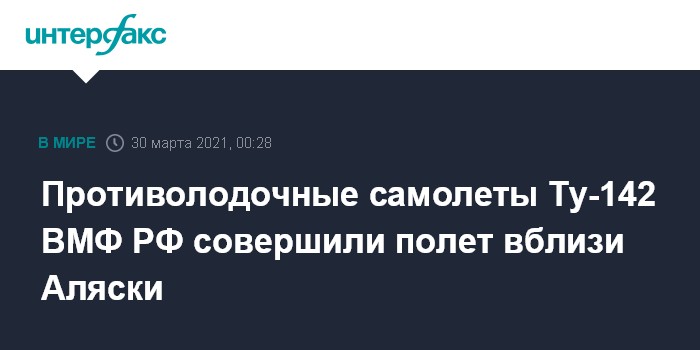 Москва. 30 марта. INTERFAX.RU - Два дальних противолодочных самолета ВМФ России Ту-142 в понедельник совершила полет вблизи Аляски, сообщило Объединенное командование аэрокосмической обороны Северной Америки (NORAD).