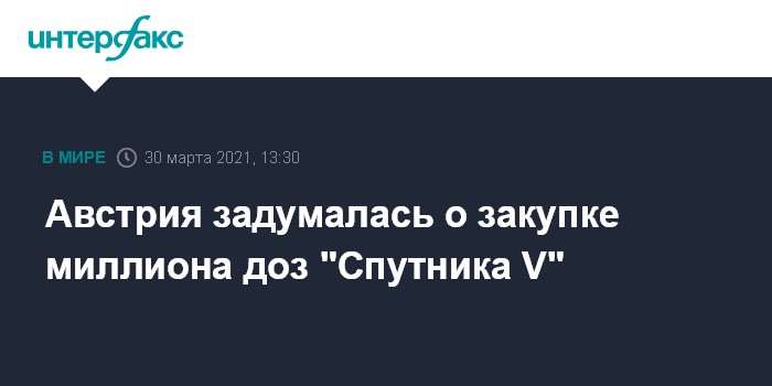 Москва. 30 марта. INTERFAX.RU - Австрия рассматривает возможность закупки 1 миллиона доз вакцины "Спутник V". Об этом сообщает портал Oe24.tv со ссылкой на канцлера республики Себастьяна Курца.