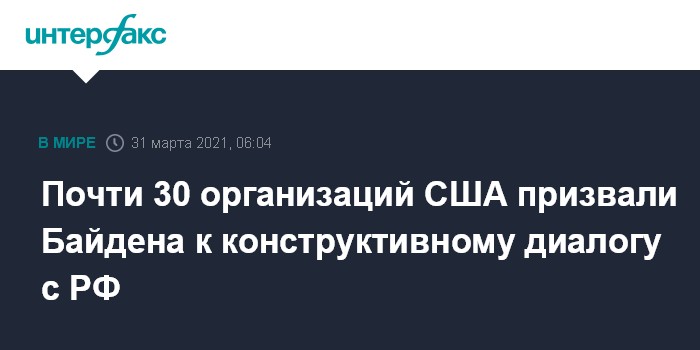 Москва. 31 марта. INTERFAX.RU - 27 американских организаций призвали президента США Джо Байдена провести "конструктивные двусторонние переговоры" с российским лидером Владимиром Путиным.