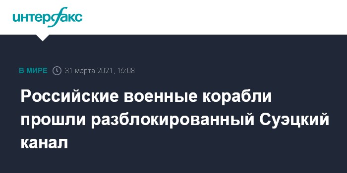 Москва. 31 марта. INTERFAX.RU - Российские военные корабли прошли Суэцкий канал после его разблокировки, сообщил Балтийский флот в среду.