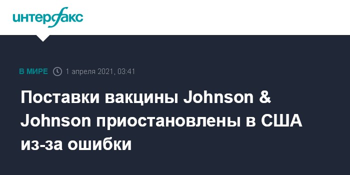 Москва. 1 апреля. INTERFAX.RU - Будущие поставки противовирусной вакцины Johnson & Johnson в США будут приостановлены из-за ошибки, совершенной рабочими на заводе-производителе в Балтиморе, сообщает Politico.