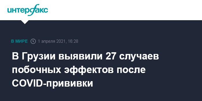 Москва. 1 апреля. INTERFAX.RU - Медиками в Грузии выявлены 27 случаев побочных явлений или реакций на вакцинирование от коронавирусной инфекции, заявил в четверг журналистам директор Национального центра контроля за заболеваниями Амиран Гамкрелидзе.