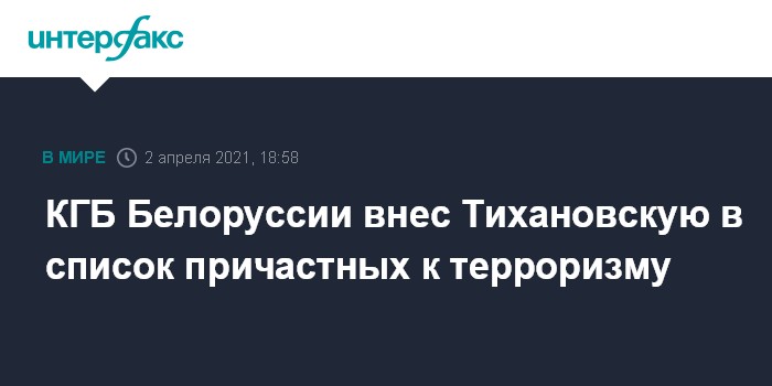 Москва. 2 апреля. INTERFAX.RU - Комитет государственной безопасности Белоруссии включил экс-кандидата в президенты Светлану Тихановскую, члена президиума Координационного совета белорусской оппозиции Павла Латушко, а также еще 15 граждан страны в Перечень организаций и физических лиц, причастных к террористической деятельности, сообщили в КГБ в пятницу.