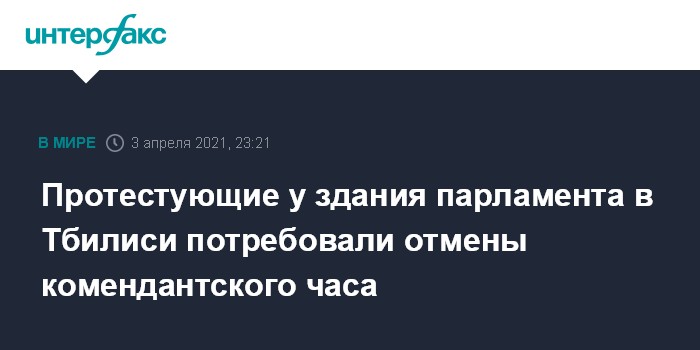 Москва. 3 апреля. INTERFAX.RU - Несколько десятков молодых людей в субботу вечером проводят акцию протеста перед зданием парламента в Тбилиси, требуя отменить действующий уже несколько месяцев комендантский час в городах Грузии с 21:00 до 5:00.