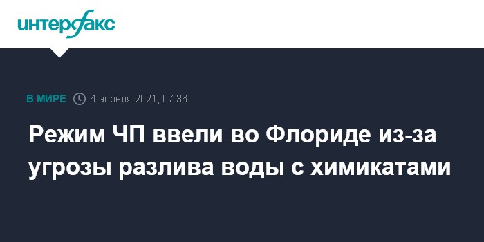 Москва. 4 апреля. INTERFAX.RU - Чрезвычайное положение было объявлено во Флориде после утечки из большого пруда токсичных сточных вод в заливе Тампа, cообщает BBC News.