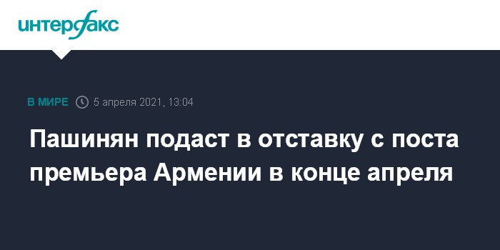Москва. 5 апреля. INTERFAX.RU - Премьер-министр Армении Никол Пашинян подаст в отставку в конце апреля, заявила руководитель правящей парламентской фракции "Мой шаг" Лилит Макунц.