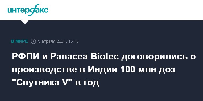 Москва. 5 апреля. INTERFAX.RU - Российский фонд прямых инвестиций (РФПИ) и индийская компания Panacea Biotec договорились производить 100 млн доз вакцины "Спутник V" ежегодно, сообщает пресс-служба РФПИ.