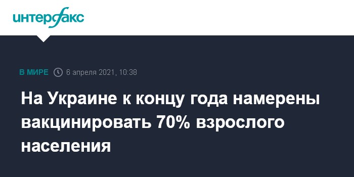 Москва. 6 апреля. INTERFAX.RU - Украина к концу 2021 года планирует предоставить возможность для вакцинации от коронавируса 70% взрослого населения, сообщил министр здравоохранения страны Максим Степанов.