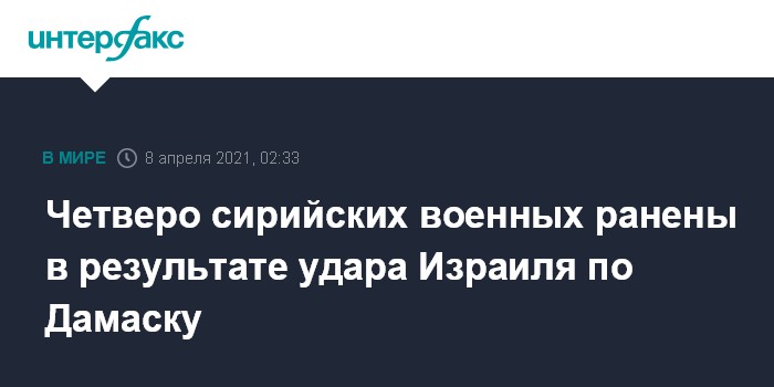 Москва. 8 апреля. INTERFAX.RU - Четверо сирийских военных были ранены в результате израильского авиаудара по Дамаску в среду вечером, сообщает сирийское государственное информационное агентство SANA.