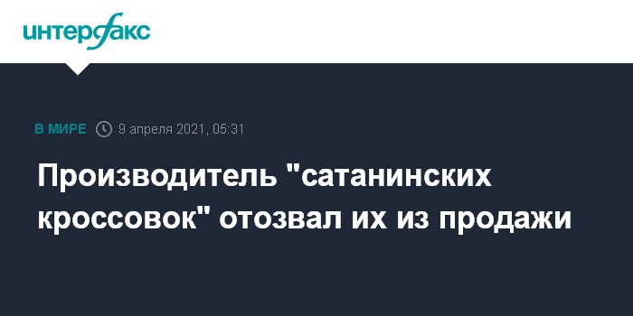 Москва. 9 апреля. INTERFAX.RU - Компания MSCHF, которая выпустила скандальные кроссовки, согласилась отозвать их из продажи, сообщает BBC News.