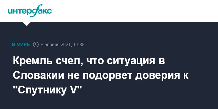 Москва. 9 апреля. INTERFAX.RU - В Кремле считают, что ситуация, возникшая с предоставленной Словакии вакциной "Спутник V", не подрывает доверия к препарату.