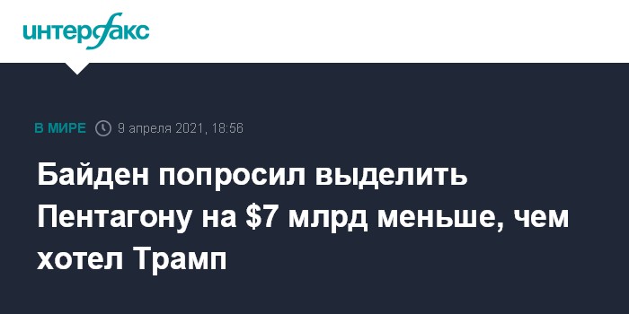 Москва. 9 апреля. INTERFAX.RU - Президент США Джо Байден предложил Конгрессу выделить $715 млрд Пентагону, чтобы, в частности, сдерживать Москву и Пекин. Об этом говорится в президентском проекте бюджета на 2022 финансовый год.