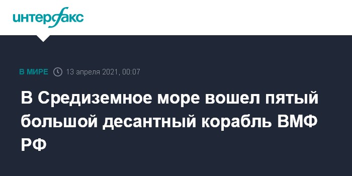Москва. 13 апреля. INTERFAX.RU - Большой десантный корабль (БДК) Черноморского флота России "Новочеркасск" в понедельник, пройдя Босфор, вошел в акваторию Средиземного моря, сообщили местные информационные порталы, публикующие фотографии его прохождения через пролив.